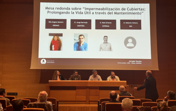 Estos ponentes dieron paso a la mesa redonda “Impermeabilización de Cubiertas: prolongando la vida útil a través del mantenimiento”, en la que participaron Jorge Bermejo (NORTEÑA), Ángela Gamero (OREMAG), Raúl Álvarez (SOPREMA) y Roberto Velasco (BMI).